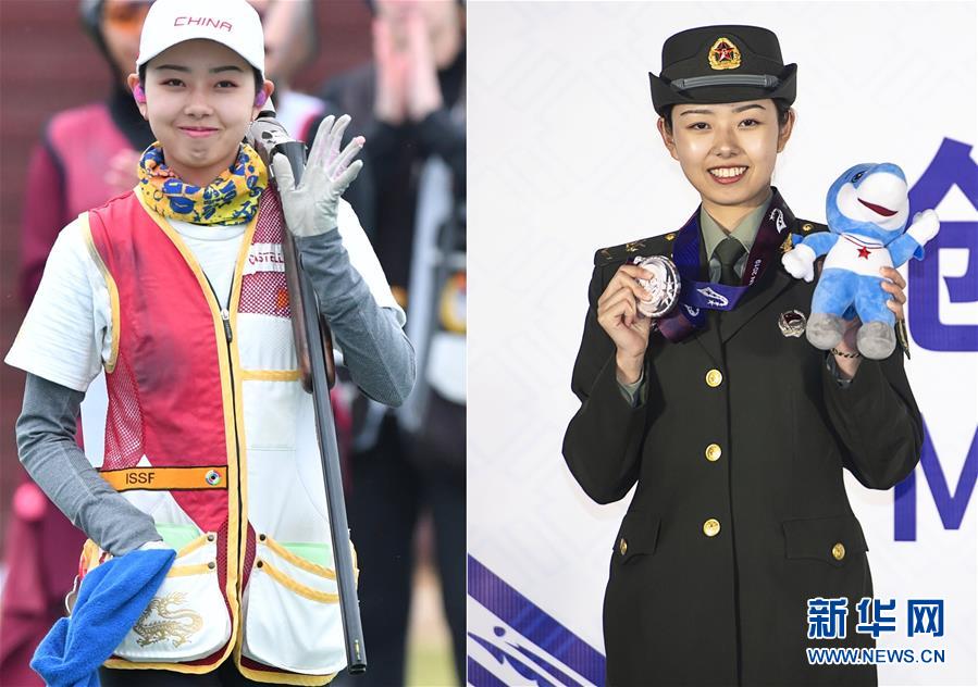 中国选手车雨霏,在武汉进行的第七届世界军人运动会女子飞碟双向个人决赛中,获得亚军。(拼版照片) 新华社发