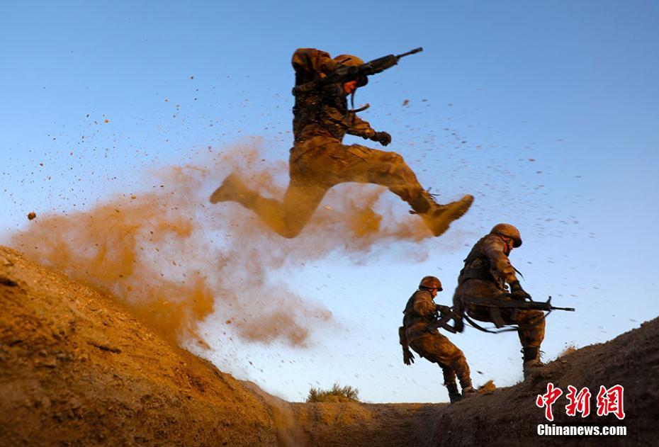 新兵奋力跨越战壕的情景。罗兴仓 摄