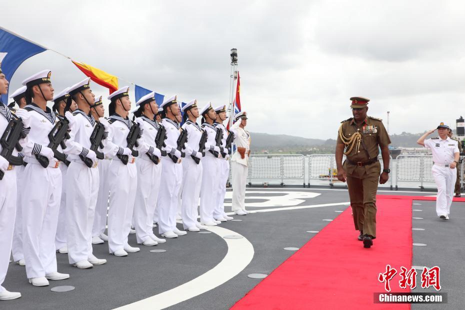 当地时间11月4日,中国海军戚继光舰抵达斐济首都苏瓦,开始对斐济进行为期4天的友好访问。这是戚继光舰入列后首次到访斐济。9月20日,中国海军新型训练舰戚继光舰搭载517名海军学员和官兵,从辽宁大连某军港解缆起航,执行远航实习任务并访问文莱、东帝汶、巴布亚新几内亚、新西兰、斐济等多个亚太国家。图为斐济武装部队副司令阿奇兹准将登舰检阅仪仗队。 中新社发 黎明宇 摄