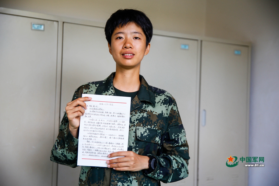 新兵雷晓雪在家信中写道:一直很喜欢军人那种酷酷的感觉,觉得不当兵将会是我一生的遗憾,如今,我终于实现了自己的梦想,我在这里每天都很开心,请爸爸妈妈放心,女儿已经长大。