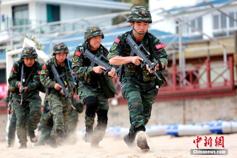 连日来,武警福建总队“魔鬼周”第一片区组织福州、莆田、漳州、龙岩和宁德支队的特战队员,在陌生海域开展抢滩登陆、滩涂追击、武装奔袭、极限体能等课目训练。图为特战队员利用队形追击“暴恐份子”。图/文 郭大伟、李东昇、饶路通、吕少、易樟林、吕明