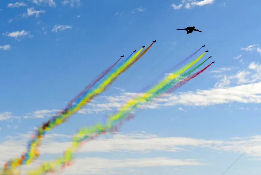 10月17日,庆祝人民空军成立70周年航空开放活动在吉林长春开幕。这是“八一”飞行表演队进行飞行表演。新华社记者 林宏 摄