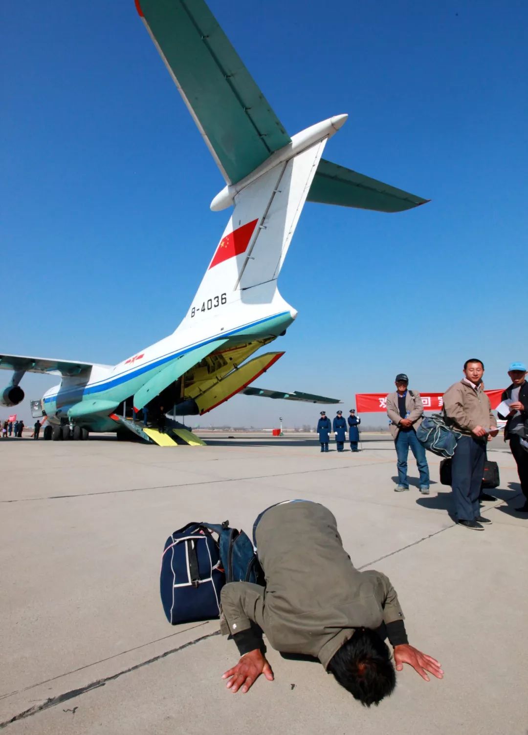 2011年3月4日,在利比亚工作的中国水电二局工人王克荣乘机回国后激动地亲吻祖国大地。当日,圆满完成撤离我在利比亚人员任务的4架空军运输机安全抵达北京南苑机场。新华社记者 查春明 摄