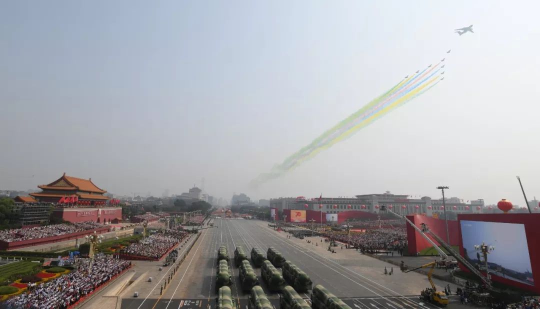 10月1日上午,庆祝中华人民共和国成立70周年大会在北京天安门广场隆重举行。这是领队机梯队。新华社记者 刘金海 摄