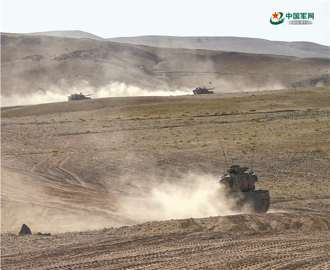 一辆辆铁甲战车卷着沙尘扑向“敌”阵。
