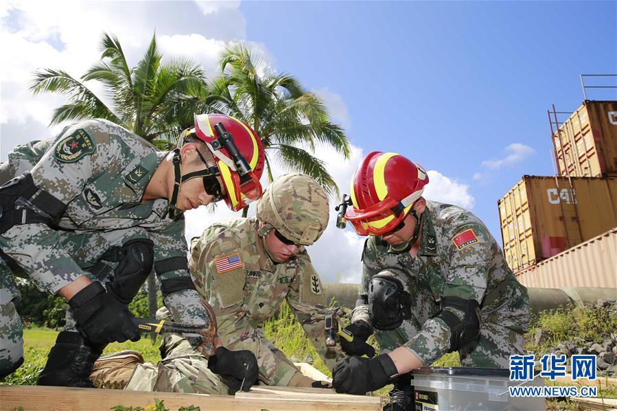 11月20日,在美国夏威夷州夏威夷岛,两军官兵共同开展支撑防护课目演练。新华社发(尹航 摄)