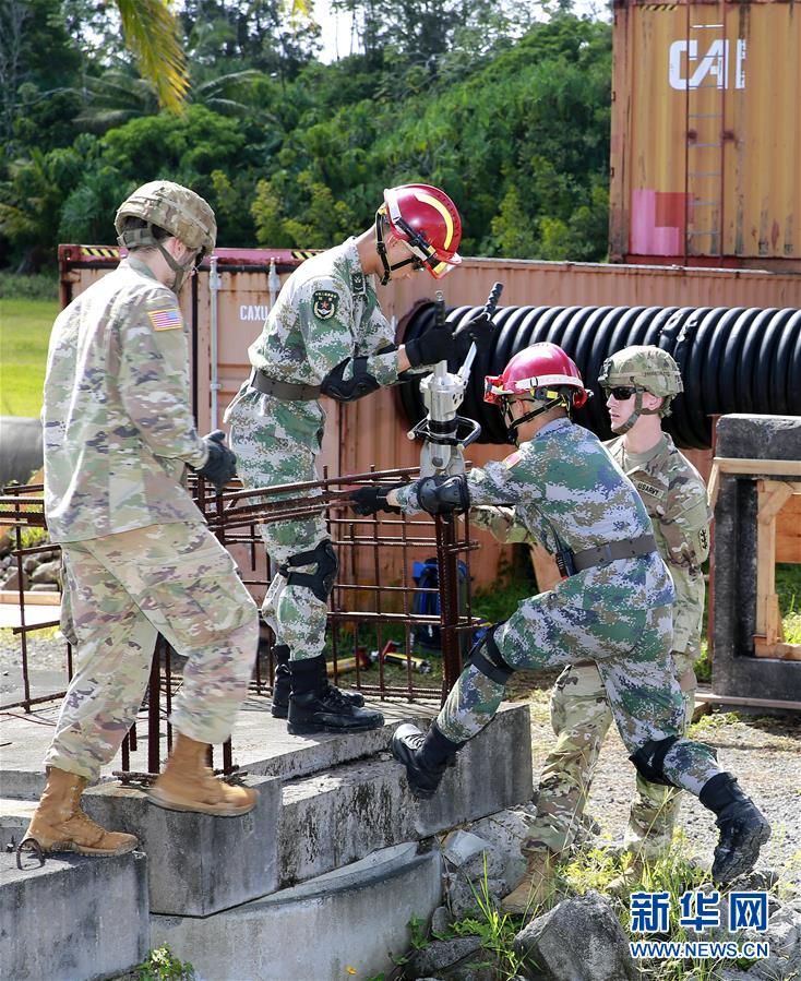 11月20日,在美国夏威夷州夏威夷岛,两军官兵协同演练狭小空间救援课目。新华社发(尹航 摄)