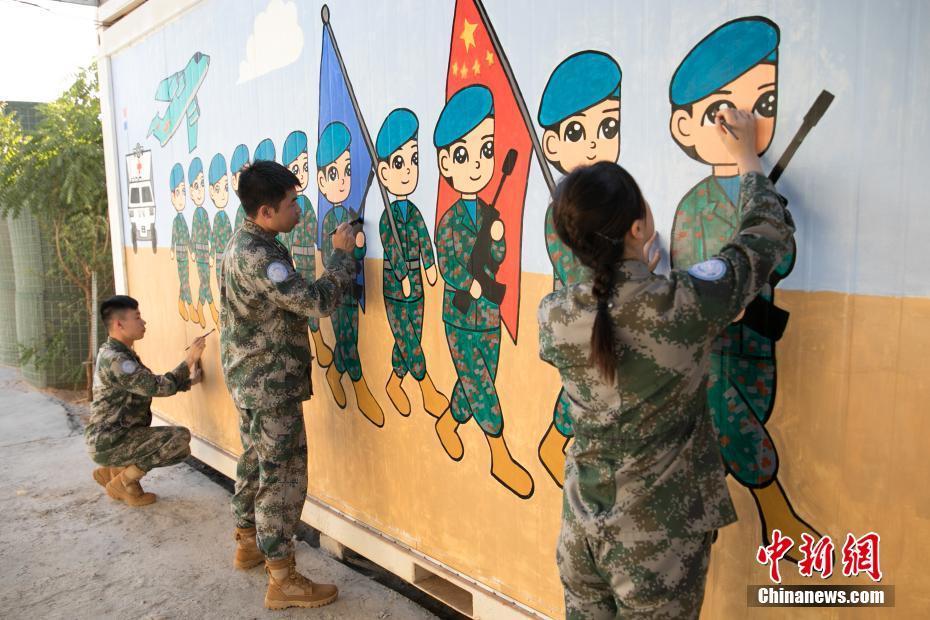 近日,中国第7批赴马里维和医疗分队组织有绘画特长的队员开展创作绘制维和系列文化墙活动。队员们把维和主题的漫画作品、创意图案等绘制在联合国驻马里综合稳定团(联马团)中国二级医院集装箱板房显著位置。中新社发 张铁梁 摄