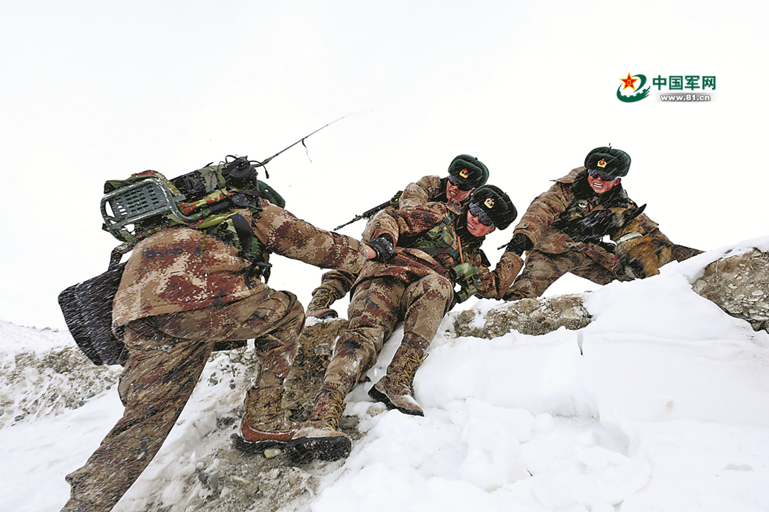 翻越红其拉甫达坂时风大雪急,官兵手拉手艰难攀爬。