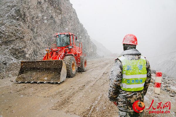 该支队官兵冒狂风顶暴雪对新藏线病害路段进行整治。陆文凯 摄