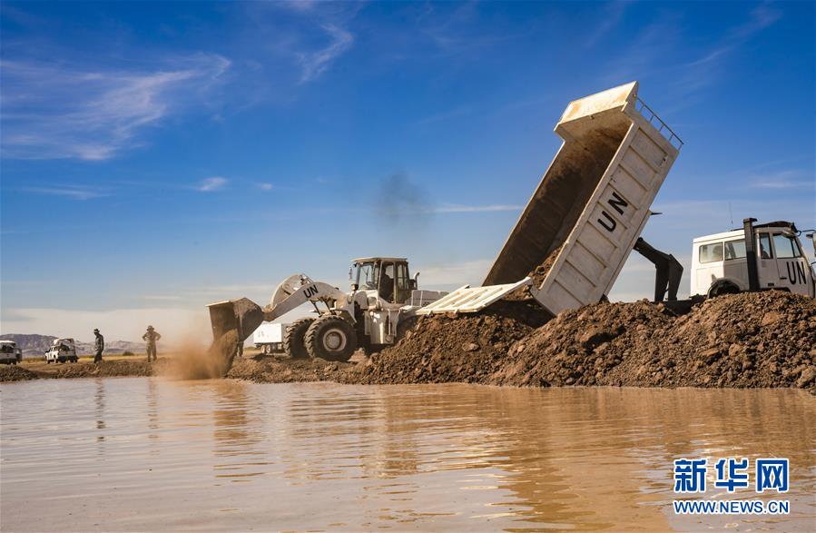 10月29日,在苏丹法希尔,中国第15批赴苏丹达尔富尔维和工兵分队回填积水坑。新华社发