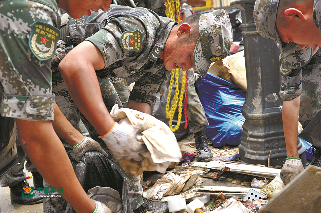 2017年8月,在超强台风“天鸽”袭击澳门后开展的救灾行动中,驻澳门部队官兵清理街区垃圾。