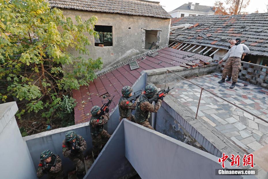 “快速潜入,捕歼犯罪分子,开始行动。”接到命令后,突击组快速奔向目标,进行控制,而侦察组则兵分两路从两翼进行抵近监视。特战队员穿过封锁线,跨过障碍,不断向“敌”纵深推进,最终成功捕歼“犯罪分子”。图为特战队员进行处置劫持人质演练。 殷立勤 摄