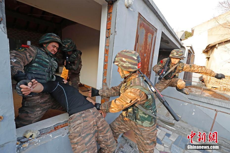 据悉,此次“魔鬼周”极限训练主要依托佘山、天马山、横山等陌生环境和复杂地域组织实施,采取全要素、全天候、全过程,按照基础课目共同练、技战术课目对抗练、昼夜连续实施的方式进行,全面锤炼和提升特战分队连续作战、一击制胜的实战能力。图为特战队员进行处置劫持人质演练。 殷立勤 摄