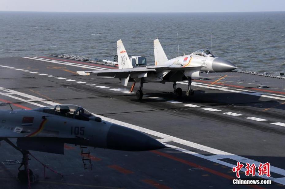 2015年12月24日,中国海军辽宁舰在渤海某海域进行舰机融合训练,新一批歼-15舰载战斗机飞行员驾机完成触舰复飞、阻拦着舰等多个课目训练。歼-15舰载战斗机在辽宁舰阻拦着舰。中新社发 李唐 摄