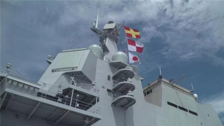 图为山东舰舰岛上挂起国际通行的海事信号旗。图片来源:央视新闻综合央视军事报道