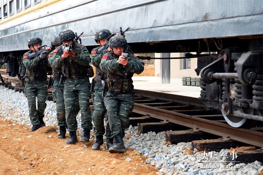 突击组趁“歹徒”放松间隙隐蔽接近火车