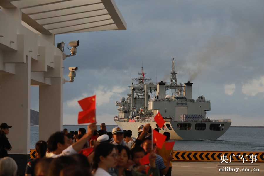 欢送仪式上,南部战区海军和三亚市、银川市有关领导,以及护航官兵亲属代表到码头送行。