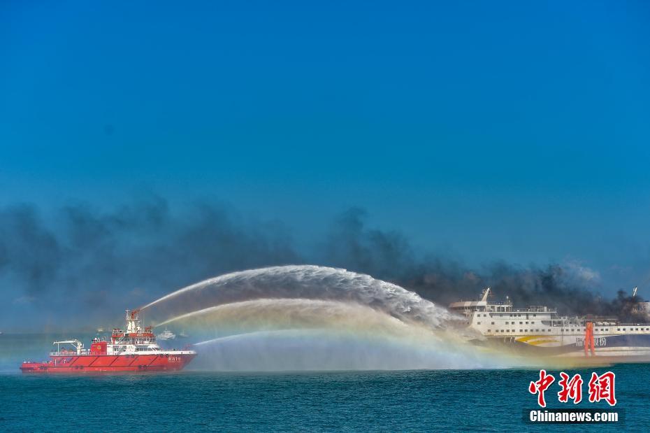 12月24日上午,海南省多个部门联合在琼州海峡开展大规模客滚运输综合应急演练。图为专业消防船对着火船只进行扑救。洪鹏坚 摄