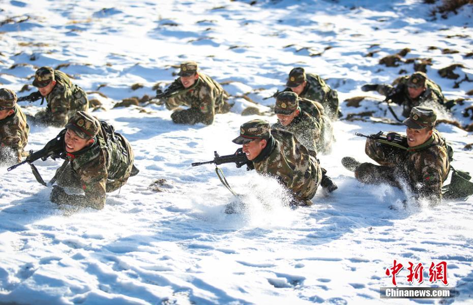 近日,在海拔3000多米的雪域高原上,武警甘肃总队新兵三大队营区2000余名新兵闻令而动,快速集结,冒着零下23摄氏度的严寒拉开了新兵野营拉练的帷幕。图为匍匐前进。侯崇慧 摄