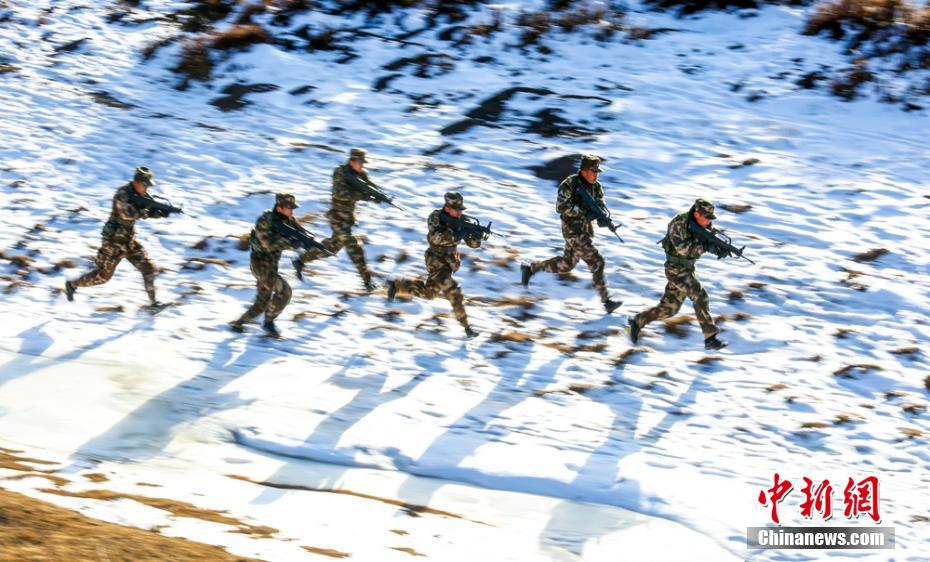 近日,在海拔3000多米的雪域高原上,武警甘肃总队新兵三大队营区2000余名新兵闻令而动,快速集结,冒着零下23摄氏度的严寒拉开了新兵野营拉练的帷幕。图为跃进通过复杂地。侯崇慧 摄