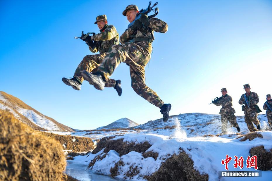 近日,在海拔3000多米的雪域高原上,武警甘肃总队新兵三大队营区2000余名新兵闻令而动,快速集结,冒着零下23摄氏度的严寒拉开了新兵野营拉练的帷幕。图为快速跨越壕沟。侯崇慧 摄