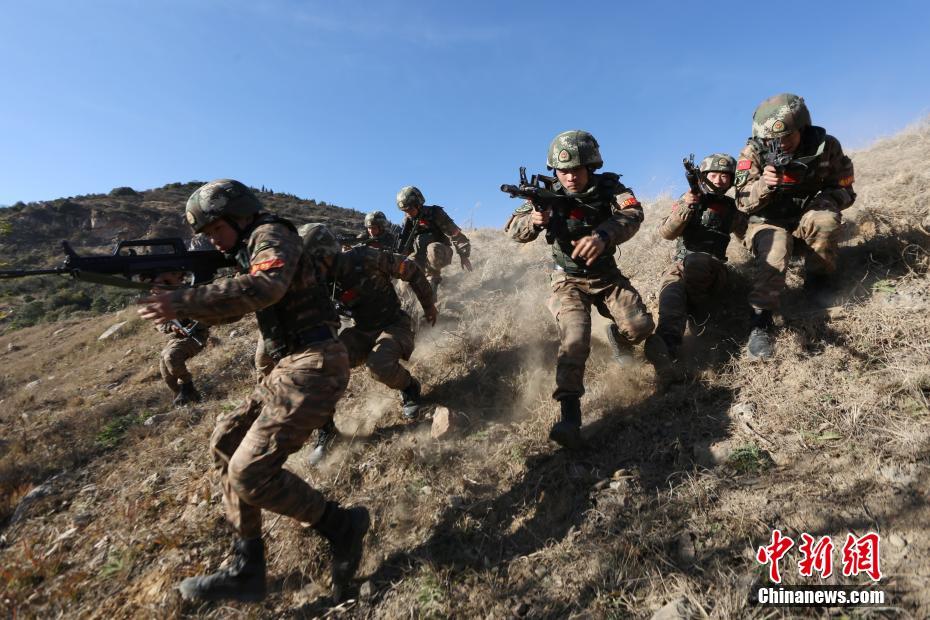 武警特战队员开展山地追逃训练。中新社发 胡程 摄