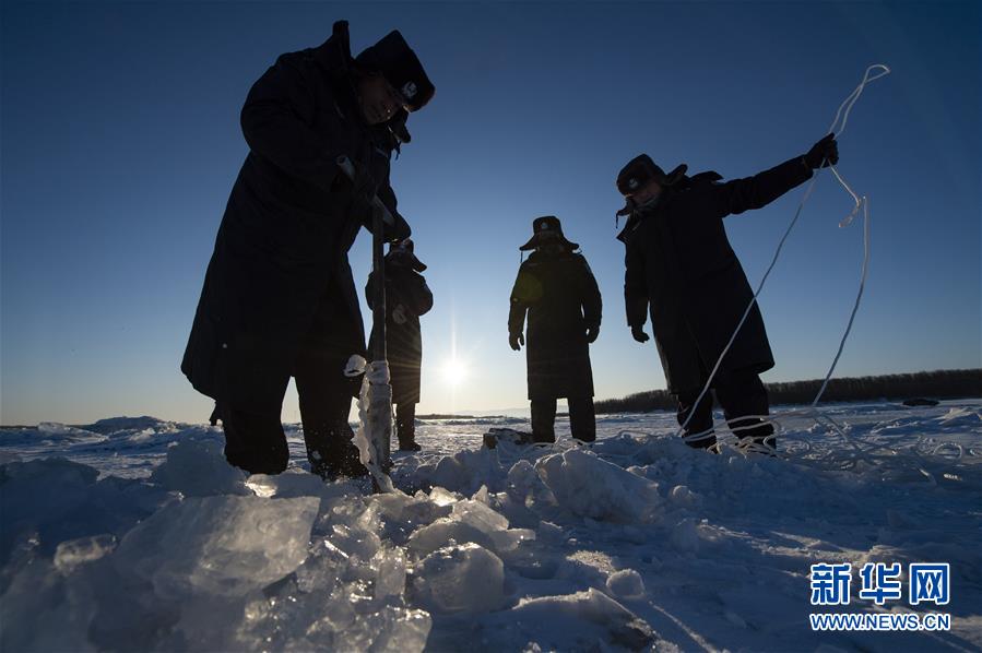 黑瞎子岛边境派出所的民警们在封冻的黑龙江上使用冰镩破冰,准备起获非法捕捞网具(2019年12月20日摄)。新华社发(谢剑飞 摄)