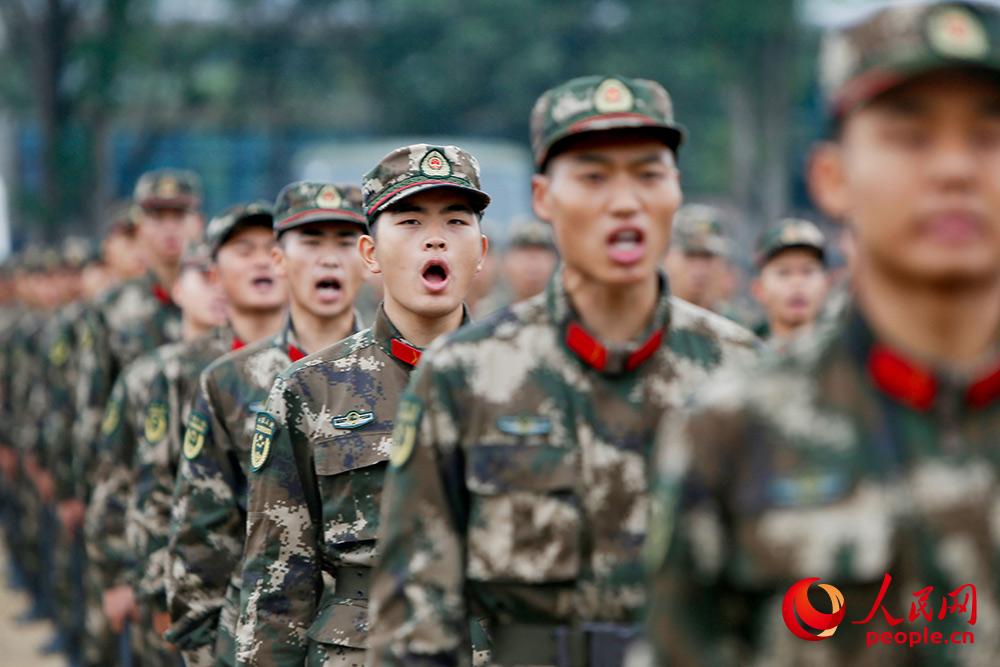 参训官兵高唱军歌。