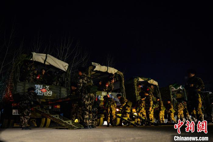 近日,武警甘肃省总队举行冬季野营拉练。图为演练官兵快速物资装载。 侯崇慧 摄