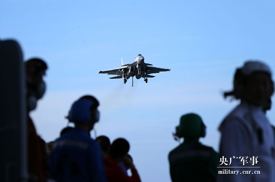 歼-15舰载战斗机即将阻拦着舰。李唐 摄