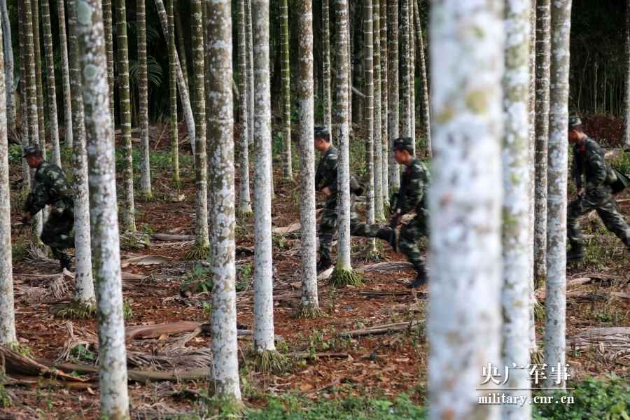 进行捕歼战斗时,拉练官兵在槟榔林快速追敌