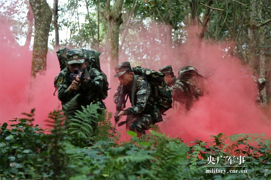 拉练官兵在浓烟中搜索前进