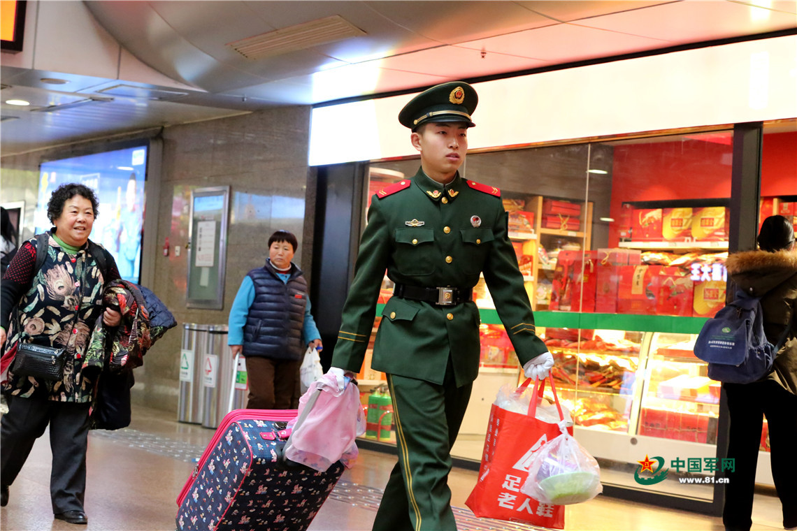 执勤哨兵帮助一位赶车阿姨前往候车室检票。赵明 摄