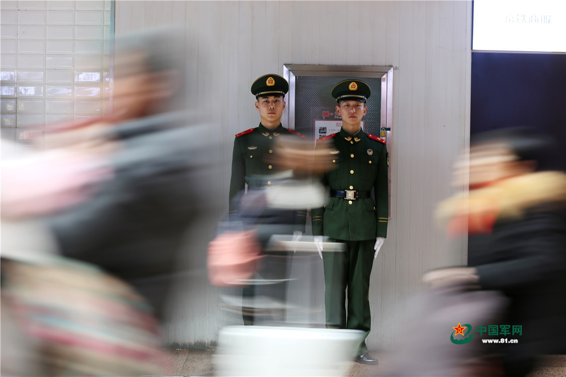 过往旅客从执勤哨兵面前匆匆经过。赵明 摄
