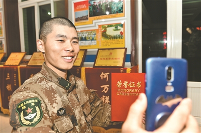 登上“龙虎榜”的新战士曹航,与家人分享喜悦。
