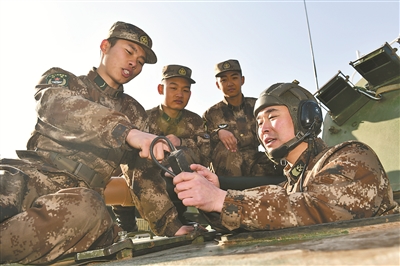 连队一级军士长丁辉(右)向新战士讲解专业技能。
