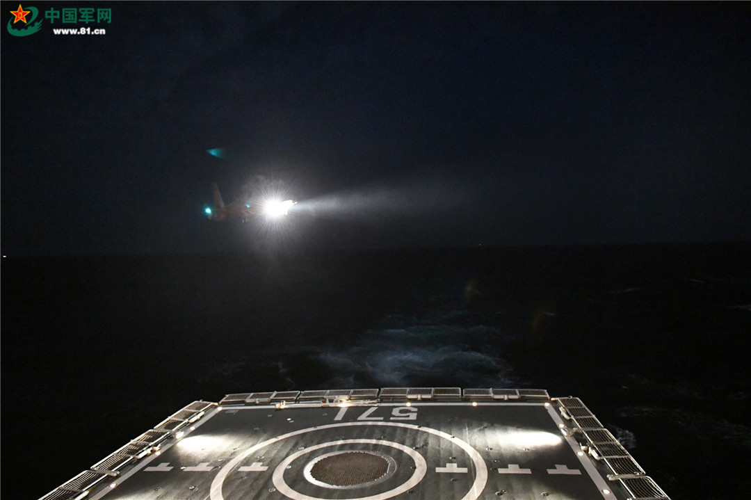 当地时间1月10日晚,参加“海洋卫士-2020”中巴海上联合演习的运城舰上,舰载直升机在夜间紧急起飞,前出引导舰艇对目标实施打击。记者 穆瑞林 摄