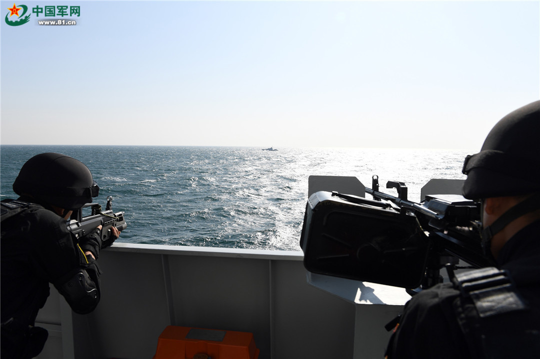 当地时间1月10日,“海洋卫士-2020”中巴海上联合演习在北阿拉伯海域举行。图为特战队员在运城舰上进行反海盗快艇袭击演练。记者 穆瑞林 摄