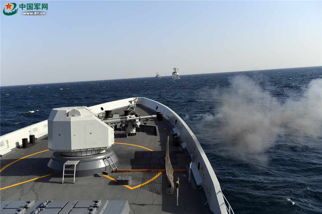 当地时间1月10日,“海洋卫士-2020”中巴海上联合演习在北阿拉伯海域举行。图为运城舰主炮对海上目标进行射击。记者 穆瑞林 摄