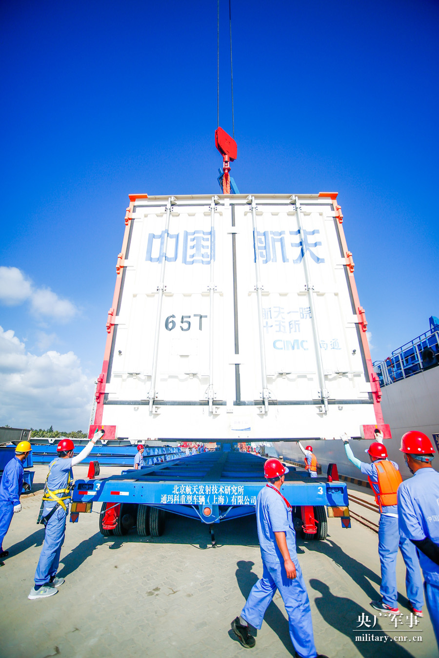 火箭集装箱安全下船,即将平稳落在特种车辆上