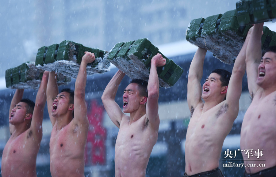官兵们在雪中进行托举弹药箱训练