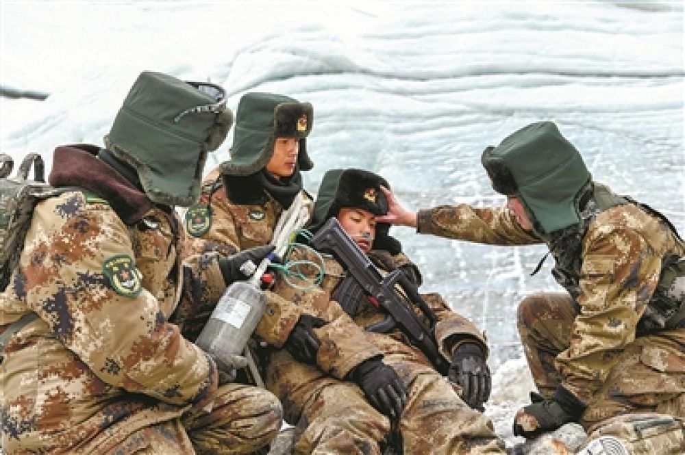 巡逻途中,一名战士因高原反应接受吸氧急救。