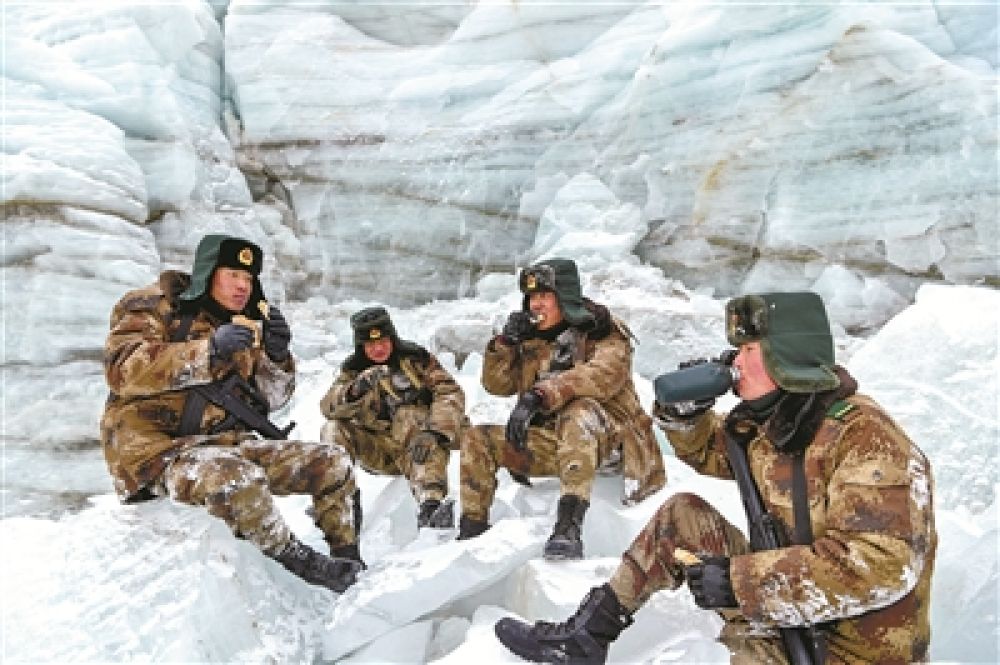 一路攀爬,巡逻队伍来到了一片亘古冰川前面。这片冰川连鹰都飞不过去,曾有5名巡逻战士牺牲于此。“在这条生死路上,先辈与后人的血脉通过一串串新旧脚印传承,尽管危险重重,但我们会义无反顾地走下去!”王旭坚定地告诉记者。