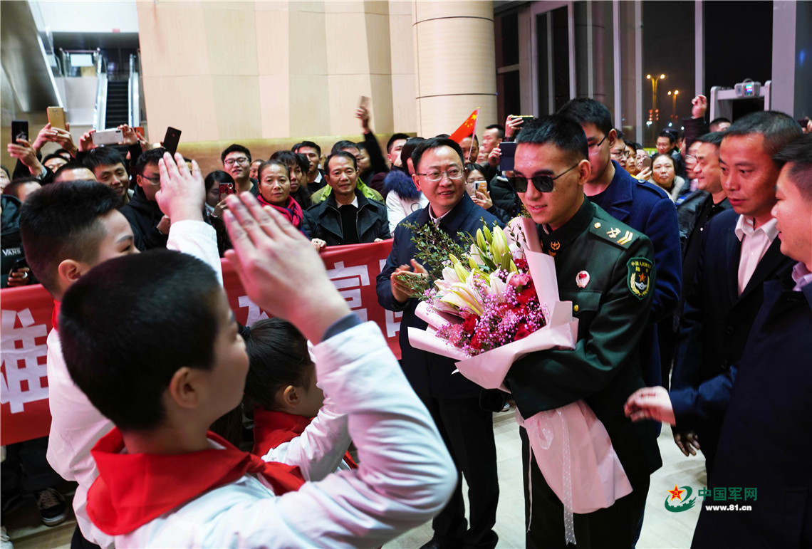 晚上,在湄潭县春节联欢晚会直播现场,家乡人民给予了杜富国最高的礼遇,大屏幕上打出“热烈欢迎排雷英雄战士杜富国回乡过年”的字幕,现场掌声不断。面对镜头,杜富国深情地说:“我心情很激动,一回到家就感受到了家乡人民的热情,被浓浓亲情围绕,我感到很幸福!祝福大家团团圆圆、新年快乐!”杜富国军姿挺拔,举起断臂,向家乡人民敬上庄严的军礼。