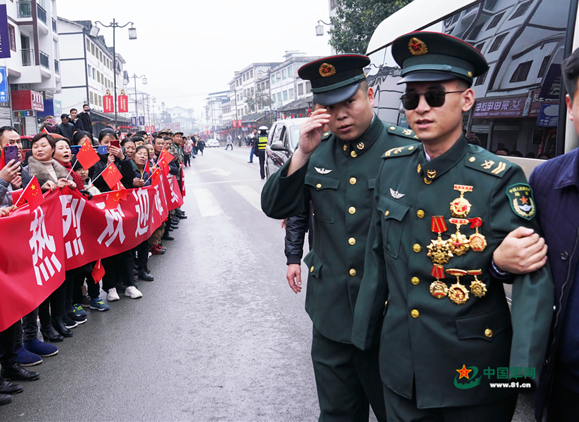 刚刚完成战备执勤任务的哨所官兵,欢迎文艺小分队到来。