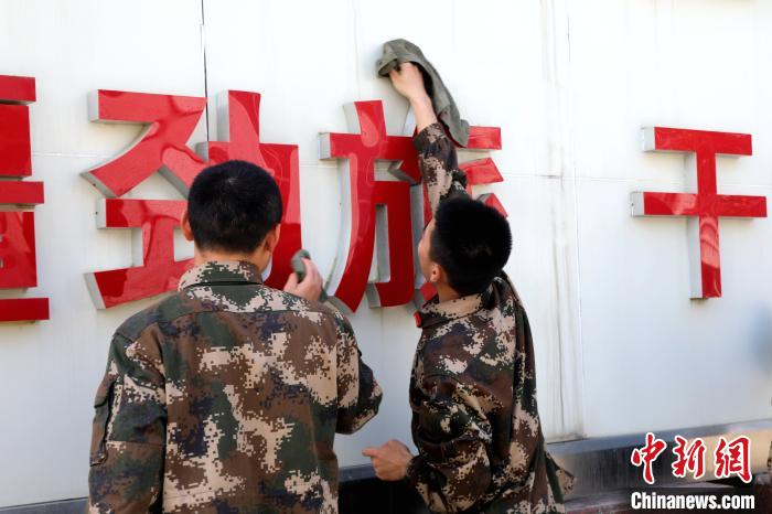 官兵清扫营院。 王彬 摄