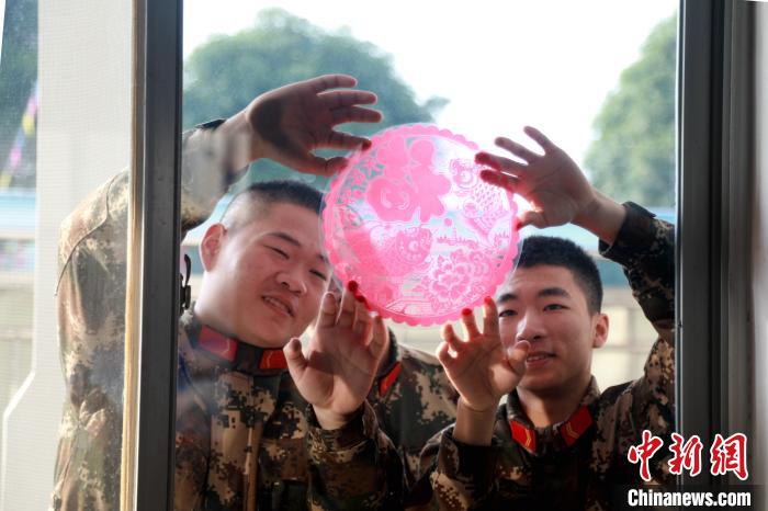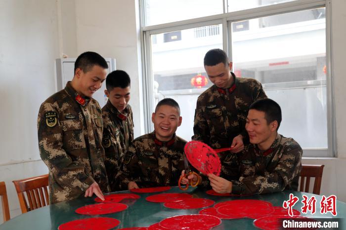 官兵剪窗花。 王彬 摄