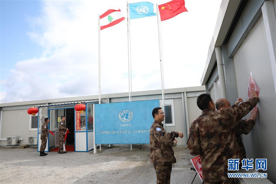 1月24日,在位于黎巴嫩东南边境的中国第18批赴黎维和医疗分队营地,官兵们在贴春联和福字迎新春。 1月25日是中国农历鼠年的新年。 新华社发(黄世峰摄)