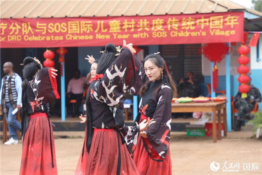 维和女兵们为孩子们表演具有“中国风”的舞蹈(吕强 摄)